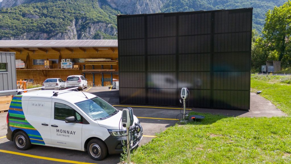 Installation solaire intégrée sur une toiture en Valais, réalisée par Monelec avec des panneaux Megasol parfaitement adaptés à l’esthétique du bâtiment.